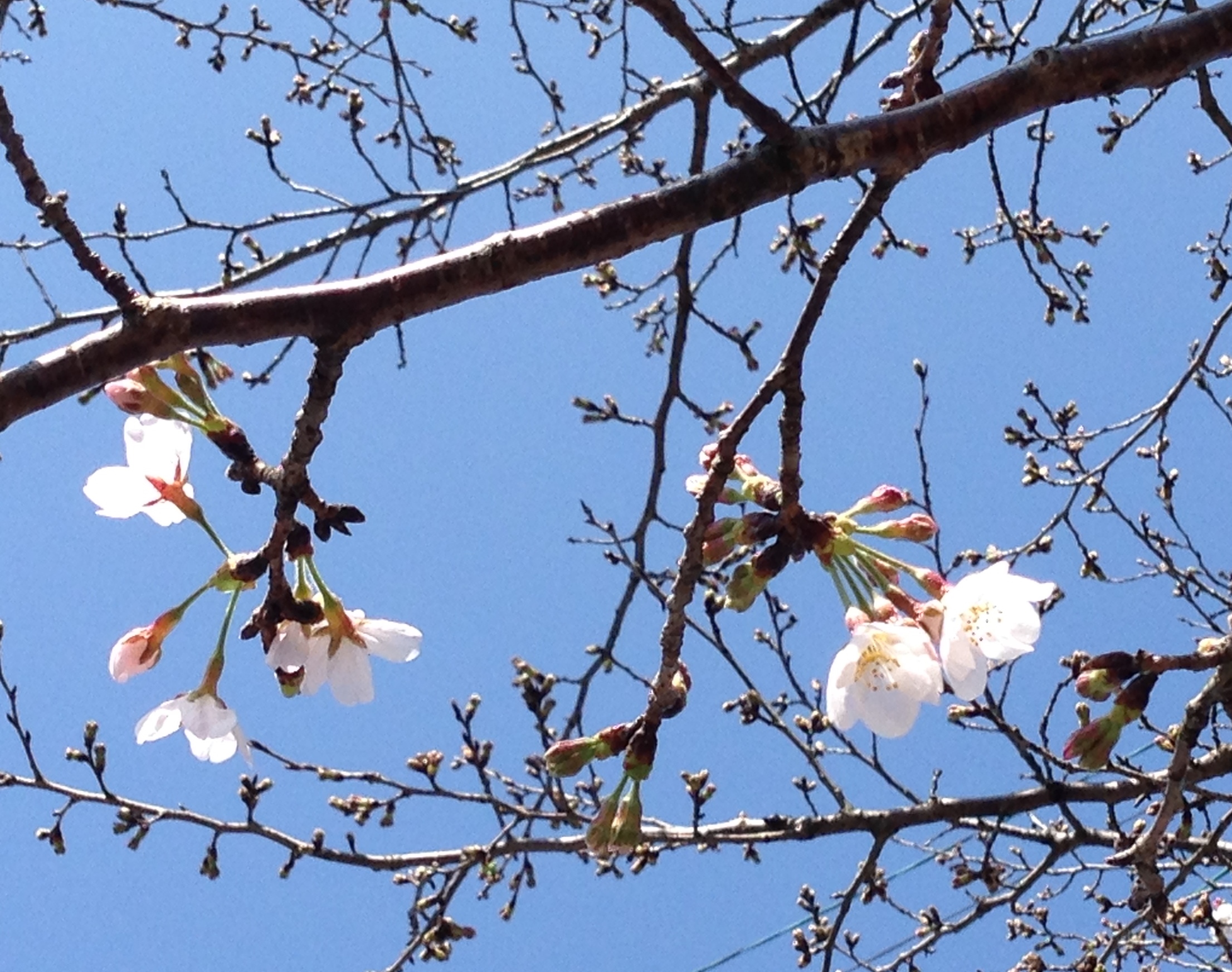 3/20(金)のお昼、天気が良いので「そろそろ開花かな?」と思って観察に行ってみました。例年いつも一番早く咲く桜の木の下で、空を見上げたらちょうど開花しておりました。少し得した気持ちになりました。春ですね。